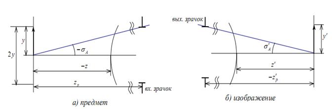 Размеры зрачков определяют через синусы апертурных углов, умноженные на соответствующие показатели преломления- “оптические синусы”. Эти размеры называются числовыми апертурами, и определяются как:
