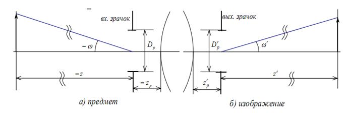 Если предмет или изображение находится достаточно далеко от оптической системы, то мы сможем осенить только его угловые размеры. Точка из которой измеряются угловые размеры предмета или изображения называется полюсом. Будем считать что полюс находится в центре входного зрачка для предмета и в центре выходного зрачка для изображения.