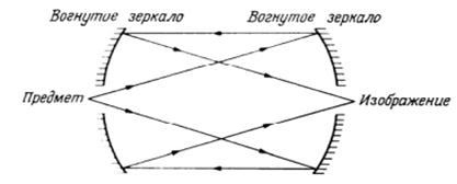 Два вогнутых зеркала, обращенные друг к другу и расположенные на расстоянии, равном их общему фокусному расстоянию, образуют удобное устройство переноса (рисунок 59). Оба зеркала могут быть параболическими, но можно всю асферическую коррекцию выполнить на одном