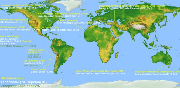 На рисунке 61 показаны места расположения крупнейших телескопов мира, жёлтым цветом обозначены названия обсерваторий, которым принадлежит телескоп, белым цветом – названия уже существующих на данный момент телескопов, сиреневым – утверждённые проекты сверхмощных телескопов (строительство некоторых из них уже началось). В скобках указан диаметр главного зеркала телескопа и количество телескопов, если их несколько.