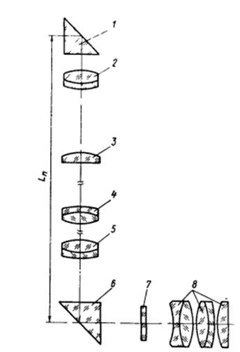 Панорамой называется труба, которая при неподвижном окуляре позволяет осуществлять круговой обзор местности. Такая труба изображенная на рисунке 70, является артиллерийским прицелом. Для осуществления кругового обзора в верхней части ее имеется прямоугольная призма 1, вращающаяся вокруг вертикальной оси и называемая головной. За прямоугольной призмой по ходу лучей установлена призма Дове 2, которая вращается по той же оси и в том же направлении, что и головная призма, но в два раза медленнее. Вследствие чего изображение предмета наблюдаемого в окуляр, не разворачивается вокруг оптической оси и остается правильно ориентированным. Т. к. преломляющие грани призмы Дове не перпендикулярны к оптической оси, то призма разворачивается в наклонную плоско параллельную пластинку не ухудшая качества изображения, если она установлена в параллельных пучках. По этой причине призму Дове в панораме устанавливают до объектива 3.головная призма вращается также вокруг горизонтальной оси, благодаря чему осуществляется наблюдение предметов находящихся под разными углами к горизонту. За ахроматическим объективом 3 установлена крышеобразная прямоугольная призма 4, которая в комбинации с призмой Дове образует призменную оборачивающую систему (оборачивает изображение создаваемое объективом).