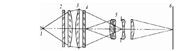 1-источник света; 2-теплофильтр; 3-конденсор; 4- диапозитив; 5- проекционный объектив; 6-экран.