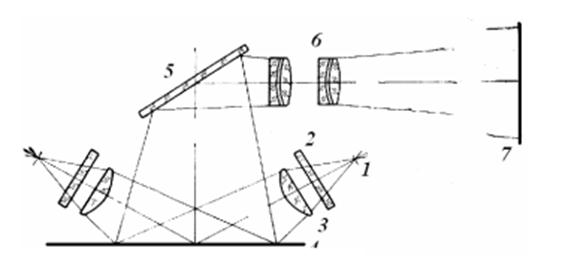 1-источник света; 2-теплофильтр; 3-конденсор; 4- диапозитив; 5-зеркало; 6- проекционный объектив; 7-экран