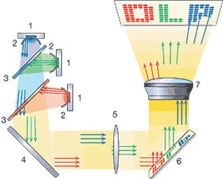 На выставке CES’2007 фирмой Mitsubishi был продемонстрирован модифицированный PocketProjector РК20 (световой поток 25 лм, разрешение 800 × 600, размеры 123 × 97 × 48 мм, масса 500 г). В качестве источников света у РК20 использована сборка из восьми светодиодов, их потребляемая мощность составляет 23 Вт, а проектора в целом — 37 Вт. Панель разъемов проектора допускает подключение любых источников информации, в том числе карты памяти SD. Предусмотрена комплектация модели аккумулятором, способным поддерживать ее работу в течение 2 ч. Оптическая схема светодиодного DLP-проектора, содержащего компоненты Oerlikon, приведена на рисунке 85. Здесь роль источников света выполняют светодиоды 1 c рефлекторами 2, последовательно излучающие световые потоки первичных цветов R, G и B. Совмещение оптических осей излучений светодиодов обеспечивается юстировкой двух дихроичных зеркал 3. Отражаясь от зеркала 4, эти потоки через оптический конденсор 5 последовательно попадают на DMD-модулятор 6, после чего объективом 7 проецируются на экран. Принципиально эта схема выглядит более эффективной, чем у DLP-проекторов. Действительно, здесь нет фильтра ColorWheel и меньше других оптических компонентов с неизбежными световыми потерями. Кроме того, в светодиодных проекторах можно легко реализовать ColorWheel с любым секторным делением введением программ-ного чередования цветов и даже сделать такие программы выбираемыми пользователем по критерию минимальной утомляемости при длительном просмотре.