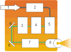 Далее световой поток через дифракционные формирователи 4, обеспечивающие равномерность излучений, поступает на корректирующий оптический компонент 3, устраняющий заметность так называемых «спеклов» — гранулированной структуры изображения, создаваемого интерферирующими когерентными пучками лазерных излучений. Сформированный таким образом равномерный световой поток белого света, отражаясь от зеркал 6, проходит модифицированный ЖК-модулятор 7 ASLM (Advanced Spatial Light Modulator) с максимальным светопропусканием 60% и проецируется объективом 8.