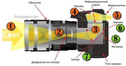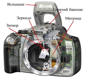 Цифровая фотографическая камера состоит из двух основных частей – корпуса и объектива. В корпусе находятся матрица, затвор (механический или электронный, а иногда и тот и другой сразу), процессор и органы управления. Объектив, съемный или жестко-встроенный, состоит из группы линз, размещенных в пластиковом или металлическом корпусе.