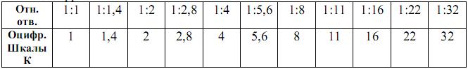 , следовательно освещенность изменяется в 2 раза. Приняты следующие значения относительного отверстия для оцифровки шкалы диафрагмы