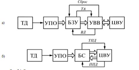 С выхода УПО двоичные коды поступают в буферное запоминающее устройство (БЗУ), где накапливаются в виде массива данных. Посредством устройства ввода вывода (УВВ) данные, накапливаемые в БЗУ, могут пересылаться в оперативную память цифрового вычислительного устройства (ЦВУ) и подвергаться дальнейшей обработке в соответствии с запрограммированным алгоритмом. Таким образом, БЗУ служит для обеспечения условий независимой работы ТД и ЦВУ, функционирующих до начала передачи данных в асинхронном режиме.