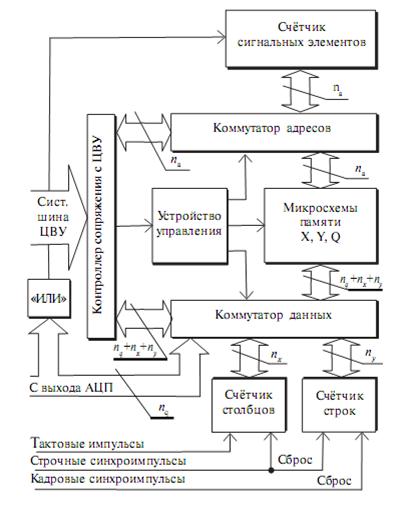 Поскольку в данном случае осуществляется запись не полного кадра, а лишь его отдельных фрагментов, содержащих полезную информацию, то помимо двоичных кодов видеоимпульсов в БЗУ необходимо записывать и двоичные коды координат соответствующих элементов. В противном случае при обработке данных в ЦВУ невозможно было бы восстановить изображения и координаты наблюдаемых объектов. Поэтому в режиме накопления на вход микросхем памяти через коммутатор данных подаются для записи не только двоичные коды сигналов с выхода АЦП, но также двоичные коды номеров строк и столбцов с выходов счётчиков. Таким образом, суммарная разрядность записываемых данных равна nq + nx + ny.