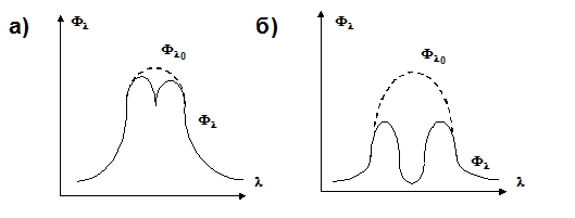 Рисунок 114. Спектры ИК излучения, прошедшего через канал сравнения 3 (рис. 29) и выделенного светофильтром 5: пунктирная кривая Ф l0 - спектральная плотность потока излучения до прохождения кюветы с газом и фильтра; сплошная кривая Ф l - спектральная плотность потока излучения после прохождения кюветы с анализируемым газом и фильтром;
