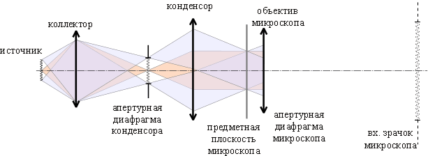 При такой схеме каждая точка источника света действует одинаково на все точки поля зрения, что обеспечивает равномерную освещенность изображения. Кроме того, все лучи, попадающие в микроскоп, участвуют в образовании изображения.