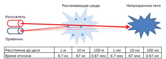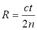 где R — расстояние до объекта, c — скорость света в вакууме, n — показатель преломления среды, в которой распространяется излучение, t — время прохождения импульса до цели и обратно.