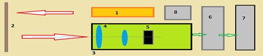 Рисунок 133. Общая структурная схема простейшего лидара (1-лазер, 2-объект, 3-блок приёмника, 4- оптическая система ПОИ(телескопическая система), 5-ПОИ, 7-блок обработки и анализа, 7-блок вывода информации, 8- блок управления лазером.