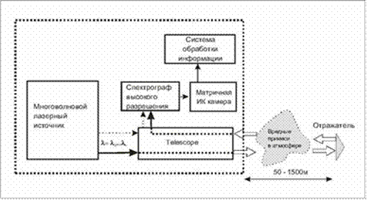 В многоволновом лидаре в качестве базовых лазерных систем применяются импульсно-периодические лазеры на CO2 и изотопах молекулы CO2 (диапазон 9-11 мкм), а также могут использоваться их вторые (диапазон 4.5-5.5 мкм) и третьи (диапазон 3.0-3.4 мкм) гармоники, полученные при преобразовании частоты излучения базовых лазеров в нелинейных кристаллах типа AgGaSe2 или ZnGeP2 с эффективностью преобразования 5-10%. Принципиальным отличием от используемых в настоящее время стандартных схем дифференциального лазерного газоанализа, в которых определяемые компоненты воздуха детектируется одна за другой, в многоволновых лазерных системах они могут определяться практически одновременно за счет выхода в генерацию набора аналитических длин волн одновременно и их одновременного детектирования после прохождения атмосферного объема с повышенной концентрацией нескольких опасных газообразных веществ.