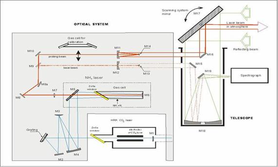 Схема применения лидара на основе многоволнового аммиачного лазера для контроля атмосферы приведен на рисунке 135. Блок – схема многоволнового лидара и его принципиальная оптическая схема приведены на рисунках 136 и 137.