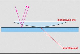 Ещё один метод получения устойчивой интерференционной картины для света служит использование воздушных прослоек, основанное на одинаковой разности хода двух частей волны: одной — сразу отраженной от внутренней поверхности линзы и другой — прошедшей воздушную прослойку под ней и лишь затем отразившейся. Её можно получить, если положить плосковыпуклую линзу на стеклянную пластину выпуклостью вниз. При освещении линзы сверху монохроматическим светом образуется тёмное пятно в месте достаточно плотного соприкосновения линзы и пластинки, окружённое чередующимися тёмными и светлыми концентрическими кольцами разной интенсивности. Тёмные кольца соответствуют интерференционным минимумам, а светлые — максимумам, одновременно тёмные и светлые кольца являются изолиниями равной толщины воздушной прослойки. Измерив радиус светлого или тёмного кольца и определив его порядковый номер от центра, можно определить длину волны монохроматического света. Чем круче поверхность линзы, особенно ближе к краям, тем меньше расстояние между соседними светлыми или тёмными кольцами. Данная методика используется для контроля оптических деталей.