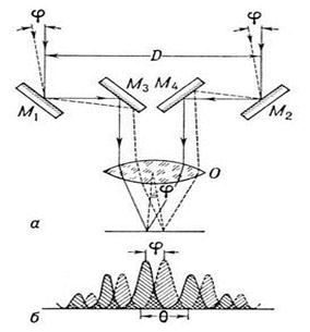 Лучи света, пришедшего от удаленной звезды, отражается от плоских зеркал M1 — M2, разнесенных на достаточно большое расстояние D, затем отражаются от двух других зеркал и собираются линзой на экране, помещенном в фокальной плоскости. Разнесенные на расстояние D зеркала можно рассматривать как точечные источники, расстояние между которыми и равно D. Вследствие этого в изображении звезды наблюдается интерференционная картина, аналогичная интерференции от двух щелей, расположенных на расстоянии D друг от друга. Угловое расстояние между соседними интерференционными максимумами в этой картине равно θ=λ/D, где λ – длина волны света. При наличии двух близких звёзд, находящихся на малом угловом расстоянии φ друг от друга, в телескопе образуются 2 интерференционные картины, которые также смещены на угол φ и накладываются друг на друга. В зависимости от соотношения углов θ и φ видимость полос суммарной картины будет различной. Изменяя расстояние D и, следовательно, изменяя угол θ, можно добиться совмещения максимумов одной интерференционной картины с минимумами другой, в результате чего видимость полос будет наихудшей. При этих условиях φ=½θ=λ/2D. Измерив D и зная λ, можно определить угловое расстояние между звёздами φ. Аналогично определяются угловые размеры одной звезды. Если звезду рассматривать как равномерно светящийся диск, то расчёт показывает, что исчезновение полос происходит при φ=1.22λ/D. Точность измерения звёздного интерферометра тем больше, чем больше база D. Построен звездный интерферометр, в котором D может достигать 18 м. что позволяет измерять угловое расстояние с точностью до 0,001". Для измерения угловых размеров очень слабых звёзд, свет от которых на уровне шумов, применяют метод корреляции интенсивностей.