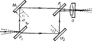 Интерферометр Рождественского – это двухлучевой интерферометр, состоящий из 2-х зеркал M1, M2 и двух параллельных полупрозрачных пластин P1, P2; M1, P1 и M2, P2 устанавливаются попарно параллельно, но М1 и М2 наклонены относительно друг друга на малый угол; расстояние М1Р1 = М2Р2 и M1P2=P1M2. Луч света разделяется пластиной Р1 на 2 луча, которые после отражений от M1, M2 и прохождения Р2 оказываются параллельными с разностью фаз