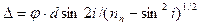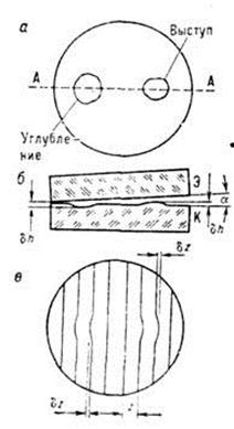 Положения этих полос определяются из условия: D=2dn+l/2=ml=const (при п~1), где d - толщина воздушного клина. Если контролируемая поверхность идеально плоская, то полосы равного наклона имеют форму прямых эквидистантных линий, параллельных ребру клина (d=const), расстояние между к-рыми равно z=l/2a (рис. 2, в) (при a=10'' и l~0,5 мкм, z=5 мм). Если же на контролируемой поверхности имеются к--л. дефекты, например, небольшие углубления или выступы, как на рисунке или она не строго плоская, то в области расположения этих дефектов наблюдаются отклонения dz от прямолинейности. При этом относит, величина отклонения dz/z связана с высотой или глубиной дефекта dh соотношением dh=(l/2)dz/z.