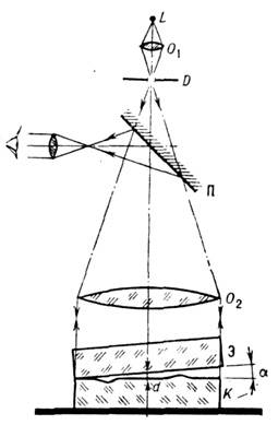 Свет от монохроматического источника L с помощью конденсора O1 диафрагмы D и объектива О2 направляется параллельным пучком на эталонную Э и контролируемую К пластинки (положенные одна на другую) почти перпендикулярно к их поверхностям. При этом строго плоская эталонная и контролируемая поверхности пластинок образуют между собой небольшой угол a. С помощью полупрозрачной пластинки П в отражённом свете наблюдаются интерференционные полосы равной толщины,которыерые локализованы в области воздушного клина между контролируемой и эталонной поверхностями.