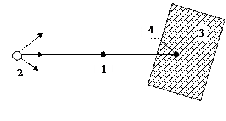 Под проекцией любой точки понимают ее как бы «теневое» отображение на какой-либо плоскости. Так, если поместить материальную точку 1 между источниками света (световых лучей) 2 и какой-либо плоскостью 3 (рис. 2.1), на этой плоскости увидим тень 4 этой точки, которую и принято называть проекцией точки.