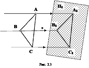 Если точку S удалить от плоскости П1 в бесконечность, проецирующие лучи будут практически параллельны между собой. Тогда они пересекутся с плоскостью проекций П1 в точках А1, В1, С1, которые называются параллельными проекциями точек А, В, С. Соединив, как и в предшествующем случае, точки А1, В1, С1 между собой, получают треугольник А1В1С1, который будет уже параллельной проекцией треугольника ABC. На рис. 2.3 стрелкой s обозначено направление проецирования. Если направление s перпендикулярно к плоскости П1, то проекция треугольника называется параллельной прямоугольной или ортогональной.