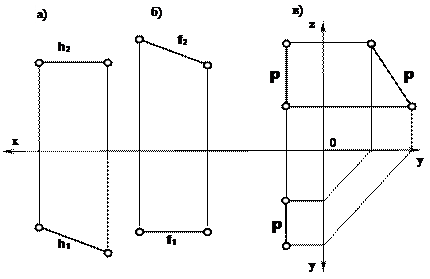 На рисунке 4.2, в прямая р параллельна плоскости П3, в этом случае ее горизонтальная проекция р1 параллельна оси у, фронтальная проекция р2 параллельна оси z, координата x для всех точек прямой постоянна, а профильная проекция прямой проекция прямой р 3 проецируется в натуральную величину.