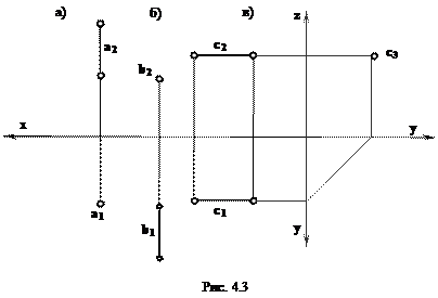 На рис. 4.3, в прямая с перпендикулярна к плоскости проекции П3 и параллельна плоскостям П1 и П2. Координаты у и z всех точек прямой постоянны. На профильную плоскость П3 прямая с проецируется в точку (профильно-проецирующая прямая).