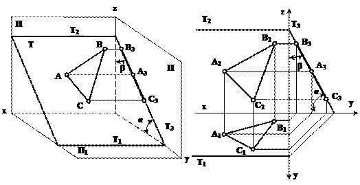 Углы α и β, которые образуются между заданной плоскостью и плоскостями проекций П1 и П2 (угол α = углу наклона плоскости T к плоскости проекции П1; угол β = углу наклона плоскости Т к плоскости проекций П2), плоскость Т проецируются на плоскость П3 без искажений. Горизонтальный и фронтальный следы плоскости параллельны оси х.