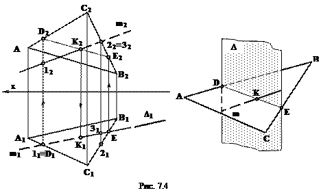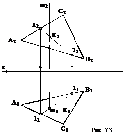 Для определения видимости прямой m на горизонтальной плоскости выбирается пара точек 1 и D (см.рис.7.4). У этих точек координаты у одинаковы у1=уD,координаты z различны (zD > z2), точка D выше точки 1 (координата точки D больше координаты точки 1). Следовательно, на горизонтальной проекции точка D видима, а 1 невидима.Tак как точка 1 принадлежит прямой m, то левее проекции точка K1 прямая m находится ниже плоскости треугольника ABC, то есть она не видима (должна быть проведена штриховой линией).
