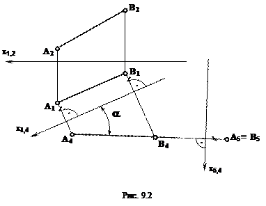 На втором этапе в системе плоскостей П1/П4 плоскость проекций П1 заменяют на П5. При этом ось х5,4 проводят перпендикулярно к проекции А4В4. В новой системе плоскостей проекций П4/П5 прямая заняла проецирующее положение, т.е. она стала перпендикулярна к плоскости П5, и на нее прямая спроецировалась в точку, а проекции концов отрезка АВ совпали (А5 ≡В5).
