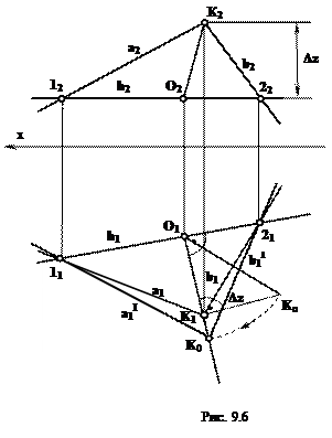 Для решения поставленной задачи проводят в плоскости угла линию уровня (в данном случае горизонталь h) и используют ее как ось вращения, вокруг которой будут вращаться прямые а и b и вершина К. Все точки вращаются в плоскостях, перпендикулярных к горизонтали, при этом положение точек 1 и 2 остается неизменным, а точка К вращается вокруг горизонтали. Из горизонтальной проекции К1 точки К проводят линию, перпендикулярную к оси вращения h1. Отрезок K1O1 - горизонтальная проекция радиуса вращения точки К. Находят натуральную величину этого радиуса (например способом прямоугольного треугольника).