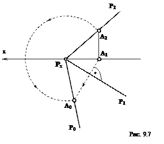Для решения поставленной задачи берут на фронтальном следе P2 плоскости P произвольную проекцию точки A и находят ее горизонтальную проекцию A 1, которая лежит на оси х. Из проекции A1 точки А проводят луч, перпендикулярный к горизонтальному следу плоскости P1 (любая точка при вращении должна перемещаться в плоскости, перпендикулярной к оси поворота). На нем находят совмещенное положение точки A — точку A0, как точку пересечения луча с дугой окружности радиусом РхА2=Rвр (Rвращения - радиус поворота проекции точки А). Точка A0 принадлежит одновременно и плоскости П1 и новому (совмещенному) положению плоскости P. Через точку A0 проводят новый фронтальный след P0 плоскости P. Следы P1 и P0 характеризуют новое (совмещенное) положение плоскости P.