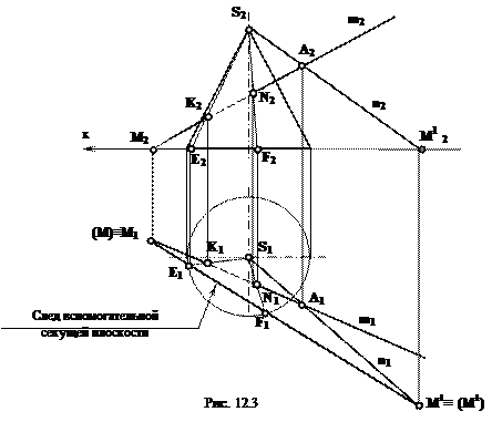 Для определения горизонтального следа плоскости Р находят горизонтальные следы прямых m и n. Следы отмечают точками, например, М1 и М'1, в которых горизонтальный след P1 плоскости Р пересекает основание конической поверхности. Проекции S1E1 и S1F1 - образующие поверхности конуса, по которым она пересекается плоскостью Р.