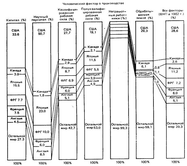На рис. 1. показаны доли шести ведущих стран в мировом (без учета стран Восточной Европы) объеме некоторых факторов производства. В целях выявления общей картины обеспеченность каждым отдельным фактором противопоставляется суммарной обеспеченности факторами производства (валовому национальному продукту - ВНП), которая приводится в крайнем правом столбце. Распределение капитала (1 столбец) несколько смещено в сторону более богатых стран. В пяти из шести ведущих стран капитал является несколько более избыточным по сравнению с остальными факторами: так, США располагают 33,6% суммарного объема капитала в мире (данные оценочные), что выше, чем их доля в 28,6% во всех факторах, создающих НД. В остальном мире, соответственно наблюдается некоторый недостаток капитала: 27,3% его мирового объема против 39,3% по суммарной обеспеченности факторами.