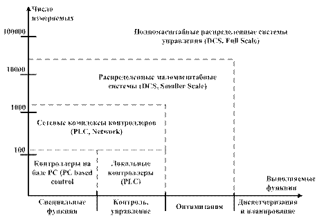 Рассматриваемые сетевые комплексы контроллеров имеют верхние ограничения как по сложности выполняемых функций (обычно, типовые функции измерения, контроля, учета, регулирования, блокировки), так и по объему самого автоматизируемого объекта, в пределах десятков тысяч измеряемых и контролируемых величин (обычно, отдельный технологический агрегат, производственный участок).