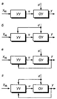 а — управление по задающему воздействию; б — управление по возмущающему воздействию; в — управление по отклонению; г — комбинированное управление (ОУ — объект управления; УУ — управляющее устройство)