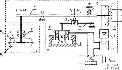 /— мембранный дифманометр; // — унифицированный токовый электросиловой преобразователь; / — вялая мембрана дифманометра; 2 — уплотняющий сильфон; 3 — основной рычаг; 4 — флажок индикатора; 5 — индикатор рассогласования дифференциально-трансформаторного типа; 6 — усилитель; 7— выпрямитель; 8— постоянный магнит; 9— катушка; 10— вспомогательный рычаг; // — подвижная опора; 12 — пружина для установки начального значения выходного сигнала;