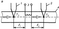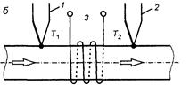 Принцип работы калориметрических расходомеров основан на зависимости среднемассовой разности температур потока от мощности нагревания. Калориметрический расходомер (рис. 88, а) состоит из нагревателя 3, расположенного внутри трубопровода 4, и двух термопреобразователей 1 и 2 для измерения температур