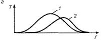 — терморезисторы); г — распределение температур в стенке трубопровода в отсутствие (/) и при наличии расхода (2) среды