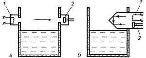 Рис. 102. Схемы фотоэлектрического уровнемера с разделенным (а) и совмещенным (б) расположением фотоэлектрического источника света 1 и светодетектора 2