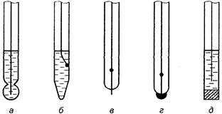 а — стеклянный мембранный электрод; металлические электроды с напыленным слоем металла (б), проволочный (в), точечный (г); д — электрод с твердой мембраной