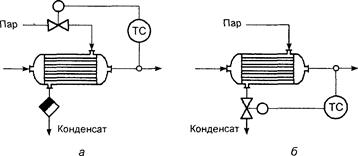 а — изменение разности температур путем изменения давления пара в паровом пространстве теплообменника; 6 — изменение поверхности теплопередачи за счет изменения уровня конденсата в теплообменнике