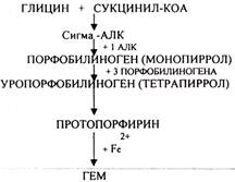 Исходным материалом в синтезе является глицин и активная форма янтарной кислоты и образующийся из них сигма -АМИНОЛЕВУМИНОВАЯ кислота (АЛК). В дальнейшем из двух молекул этой кислоты образуется МОНОПИРРОЛ. Далее при конденсации четырёх молекул монопиррола образуется ТЕТРАПИРРОЛ, дальнейшее превращение которого в гем предусматривает ДЕКАРБОКСИЛИРОВАНИЕ, окисление с последующим включением атома железа. Печень и костный мозг с ядросодержащими эритроцитами занимают центральное место в биосинтезе. В меньшей степени биосинтез возможен в почках и слизистой кишечника.