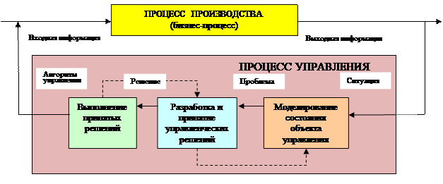 Процессы управления представляют собой реализуемые в форме бизнес-процессов алгоритмы управления основными и обеспечивающими бизнес-процессами организации. Особенность этих процессов заключается в типовой форме организации управления организационно-технологическим объектом, когда процесс управления представляется как совокупность циклических действий, связанных с выявлением проблем, поиском и организацией выполнения принятых решений(рисунок 10). Различие между процессами определяется параметрами и функциями управляемых объектов, входящих в состав переменных и постоянных ресурсов процесса управления.