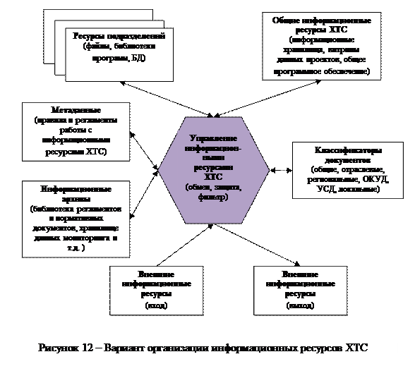 Форма представления данных информационного объекта определяется его статусом, форматом и задачами подразделения организации, в котором он используется. Он содержит данные, поступающие из разных организационных структур информационных ресурсов ХТС, обмен которыми происходит через блок управления. На рисунке 12 представлен вариант организации информационных ресурсов ХТС.