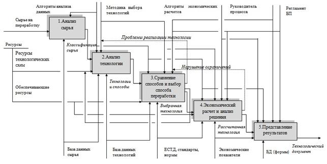 На рисунке 14 представлена контекстная диаграмма бизнес-процесса «выбор оптимальной химической технологии». Входными ресурсами ХТП являются: сырье на переработку, ресурсы технологических схем, обеспечивающие ресурсы. На выходе заполняется документ, описывающий основные характеристики выбранной технологии. В качестве управляющего воздействия в бизнес-модели используются: алгоритмы анализа данных, методики выбора технологий, алгоритмы экономических расчетов, регламент бизнес-процесса. В ходе реализации бизнес-процесса используются: база данных сырья, база данных технологий, требования стандартов и норм, экономические показатели, базы типовых форм документов.