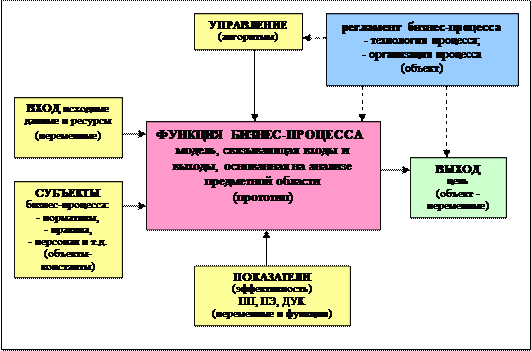 В общем виде любая работа (функция) бизнес-процесса в случае использования для ее реализации формализованной модели, представляет собой описание не декомпозируемой функции в диаграмме IDEF0. На рис. 16 представлена контекстная диаграмма, в соответствие с которой составляется формализованная модель функции бизнес-процесса, т.е. модель, в которой определена взаимосвязь между входными и выходными переменными функции.