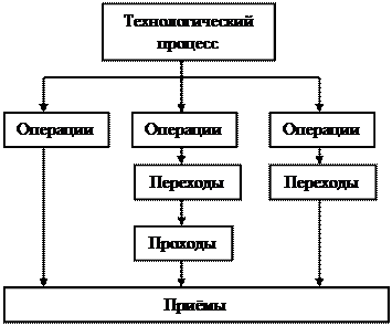 Технологический процесс обычно расчленяется на отдельные составные части: технологические операции, установы, переходы, ходы, позиции, приемы (рис.1.3).