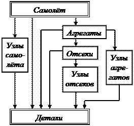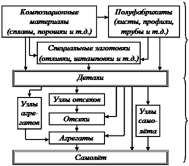 Агрегаты, отсеки, панели и узлы являются сборочными единицами. В различных конструкциях ЛА степень членения планера может быть различной. Например, есть ЛА, которые конструктивно членятся только на агрегаты, без разделения последних на секции и панели. Существуют конструкции, в которых агрегаты делятся на секции, но панели не выделяются в самостоятельные сборочные единицы. На рис.2.4 представлена принципиальная схема преобразования исходных материалов в разнообразные по свойствам и назначению детали. При этом очередность изготовления деталей определяется последовательностью изготовлению частей ЛА (рис.2.5). Метод деления ЛА на части определяет и деление общего ТП изготовления ЛА составляющие. ТП изготовления элементов членения авиационных конструкций являются частными ТП.
